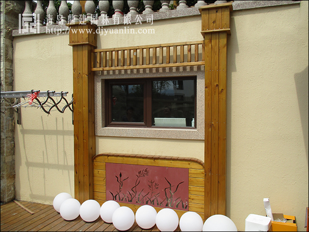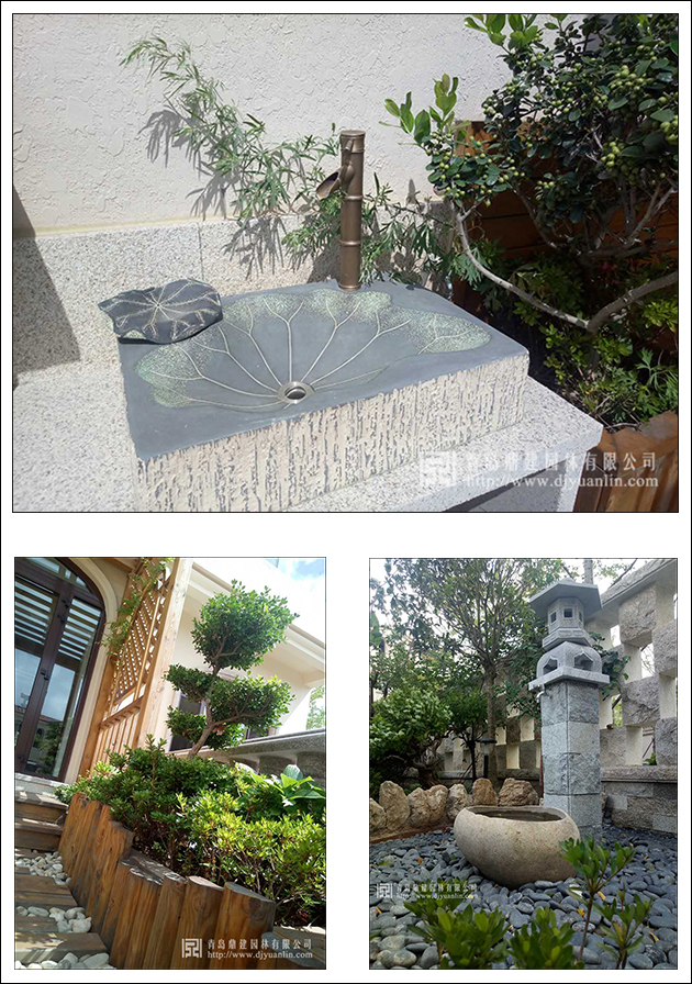 門前地面防腐木鋪裝鑲嵌鵝卵石,收邊采用木樁圍欄,高低錯落,增加韻律感。蹲踞屬于水手缽的一種,上方設(shè)石燈方便晚上照明,卵石置底有利于透水,周圍的踏石在茶道里面叫役石,其擺放也是有講究的。