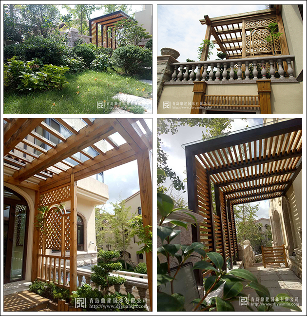 鋼架結(jié)構(gòu)與防腐木結(jié)合,頂面鋼化玻璃壓頂,彰顯大氣。二樓廊架旁的凌霄勢頭正旺,相信不多時就會形成天然簾帳,散著花香充滿浪漫色彩。