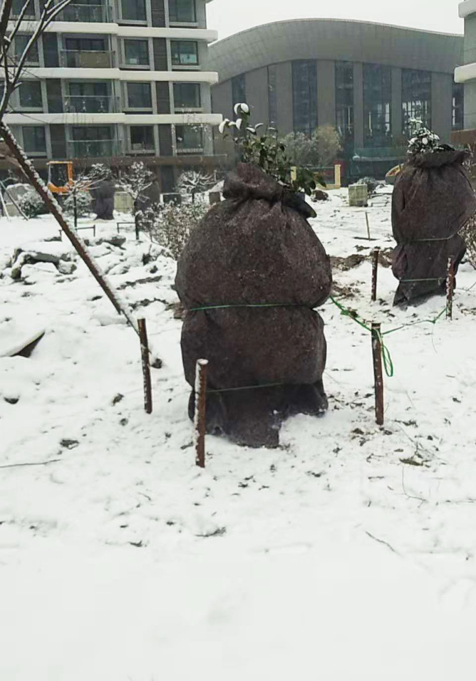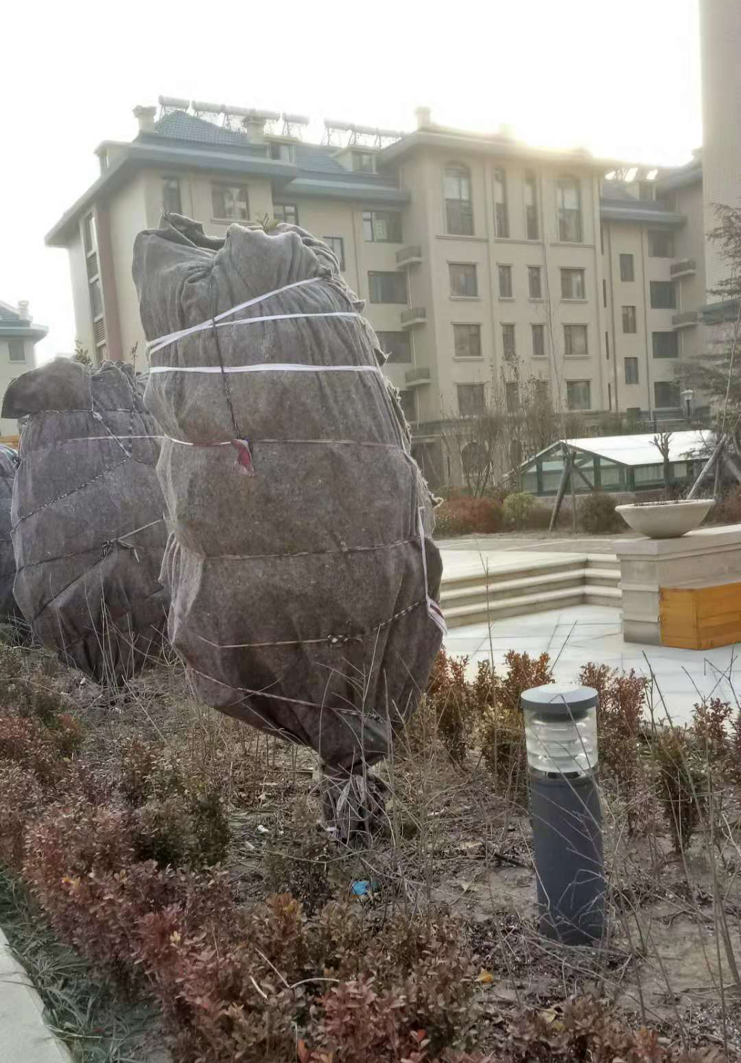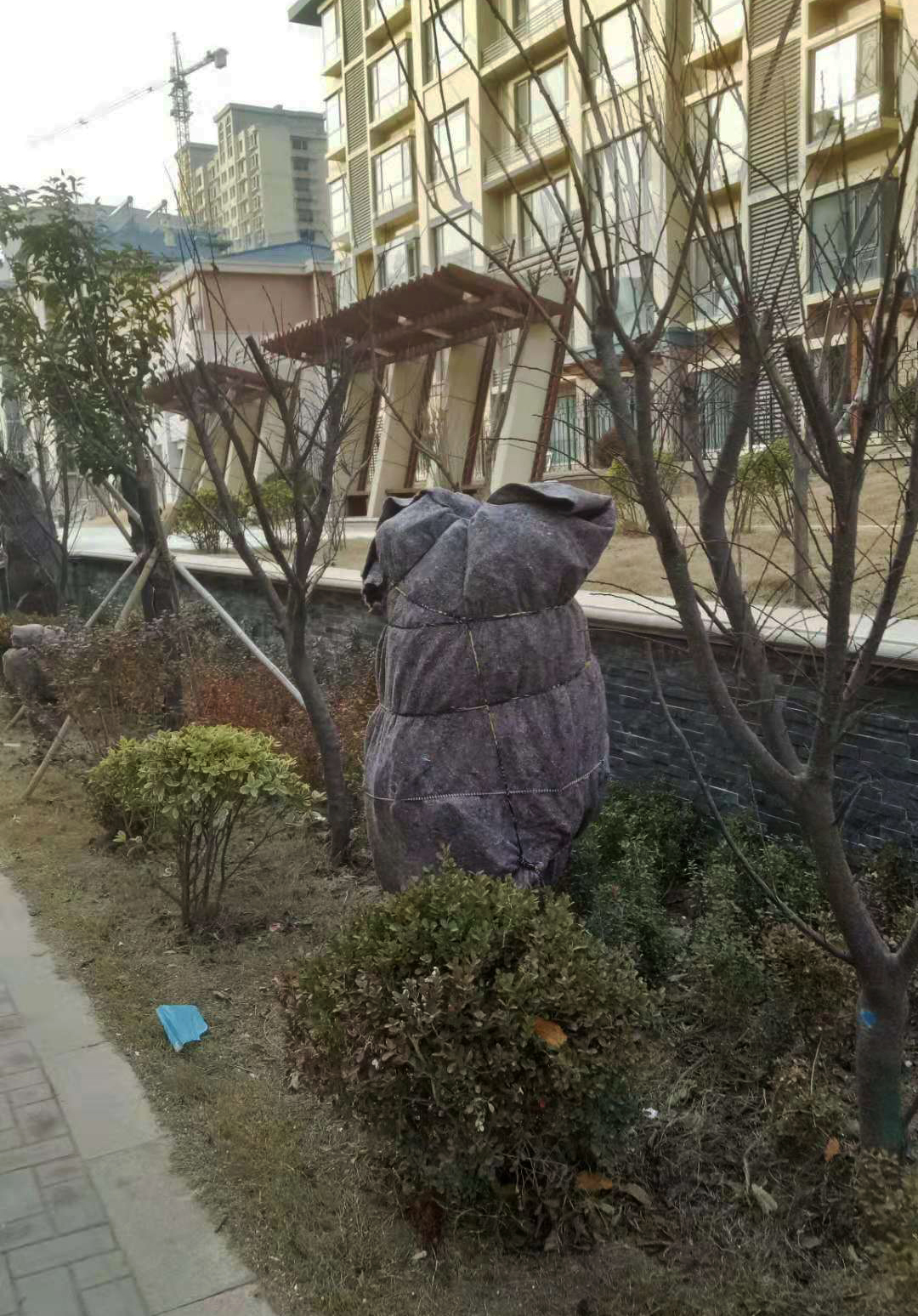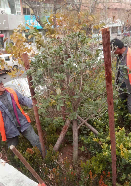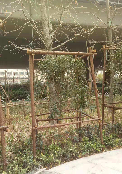 對于南種北移的球類:大葉黃楊球、紅葉石楠球、海桐球、金葉女貞球、構(gòu)骨球等使用草簾圍裹或者彩條布包扎等措施保溫保護。