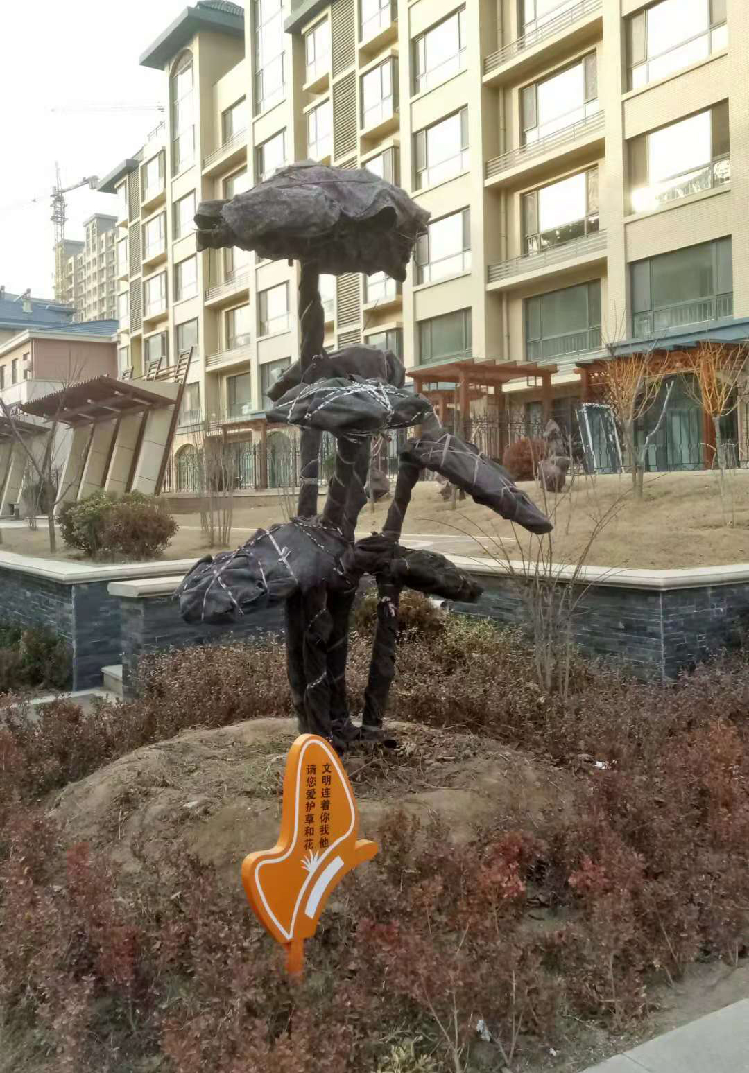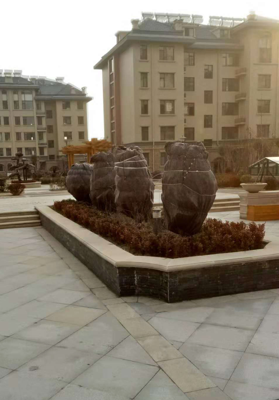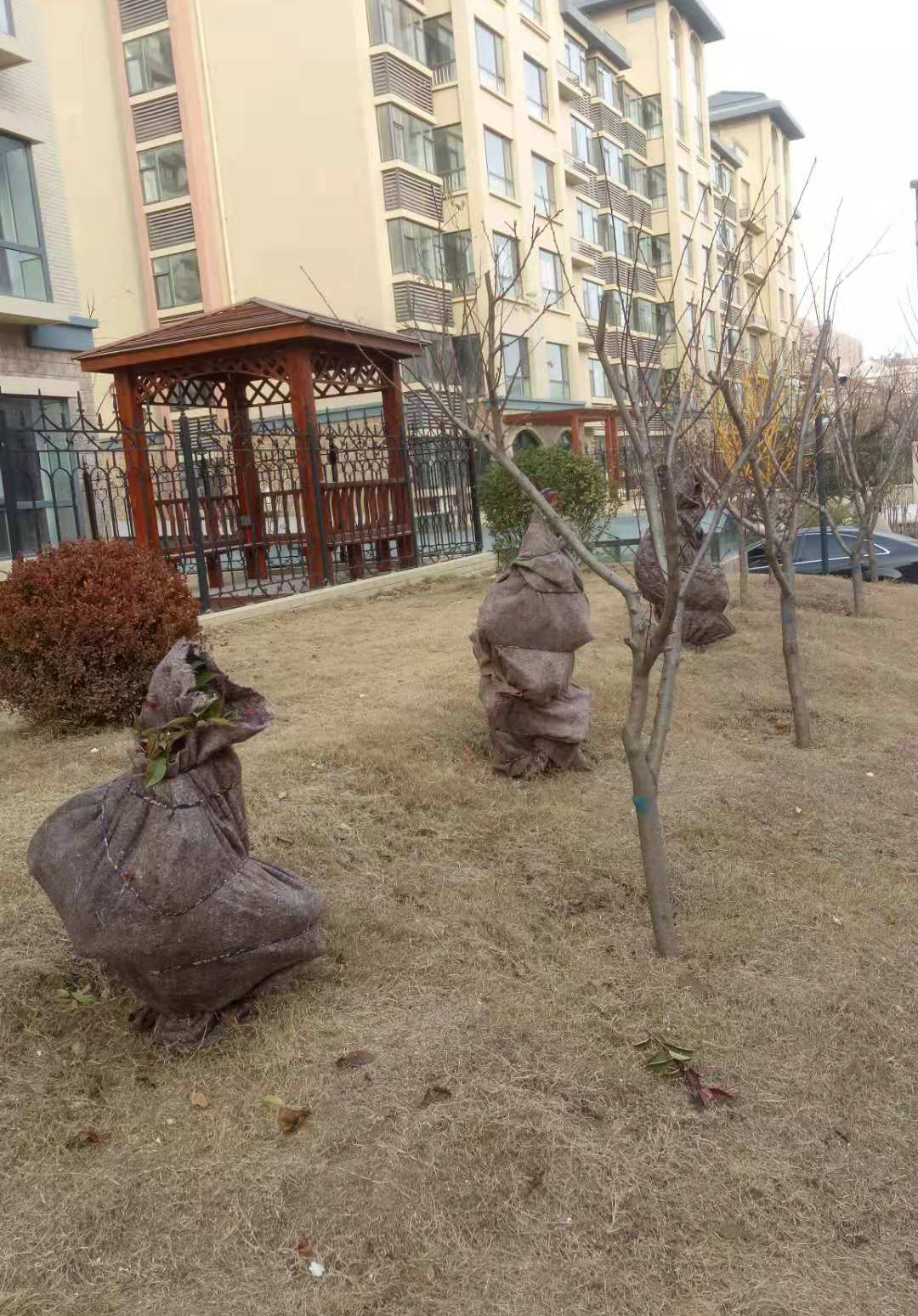 對于南種北移的球類:大葉黃楊球、紅葉石楠球、海桐球、金葉女貞球、構(gòu)骨球等使用草簾圍裹或者彩條布包扎等措施保溫保護。