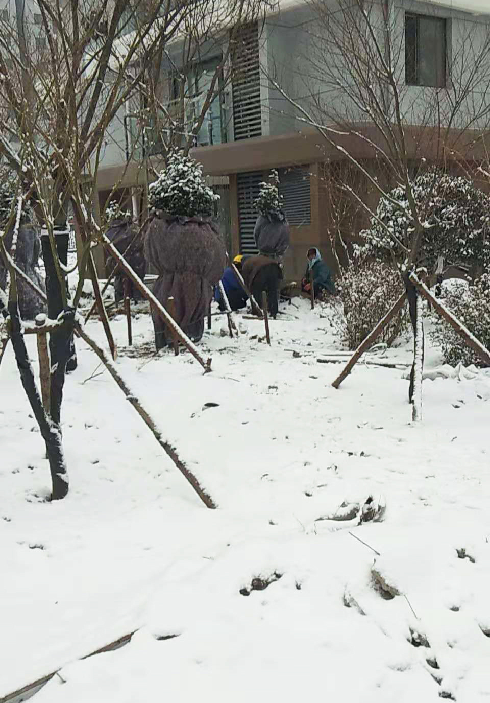 最近普降大雪,降雪之后及時組織打落樹冠上積雪,尤其是冠大枝密的常綠樹防止發(fā)生積雪壓壞樹枝。